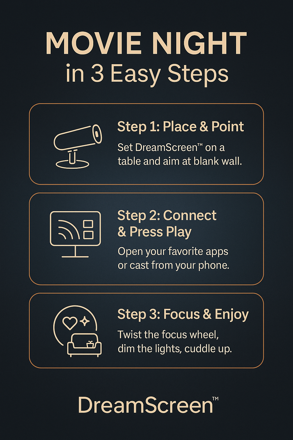 Lights low, blanket pile high, everyone scoots a little closer. DreamScreen™ turns a plain wall into your family’s cozy theater—cartoons feel bigger, bedtime feels softer, and “one more episode?” becomes one more cuddle.